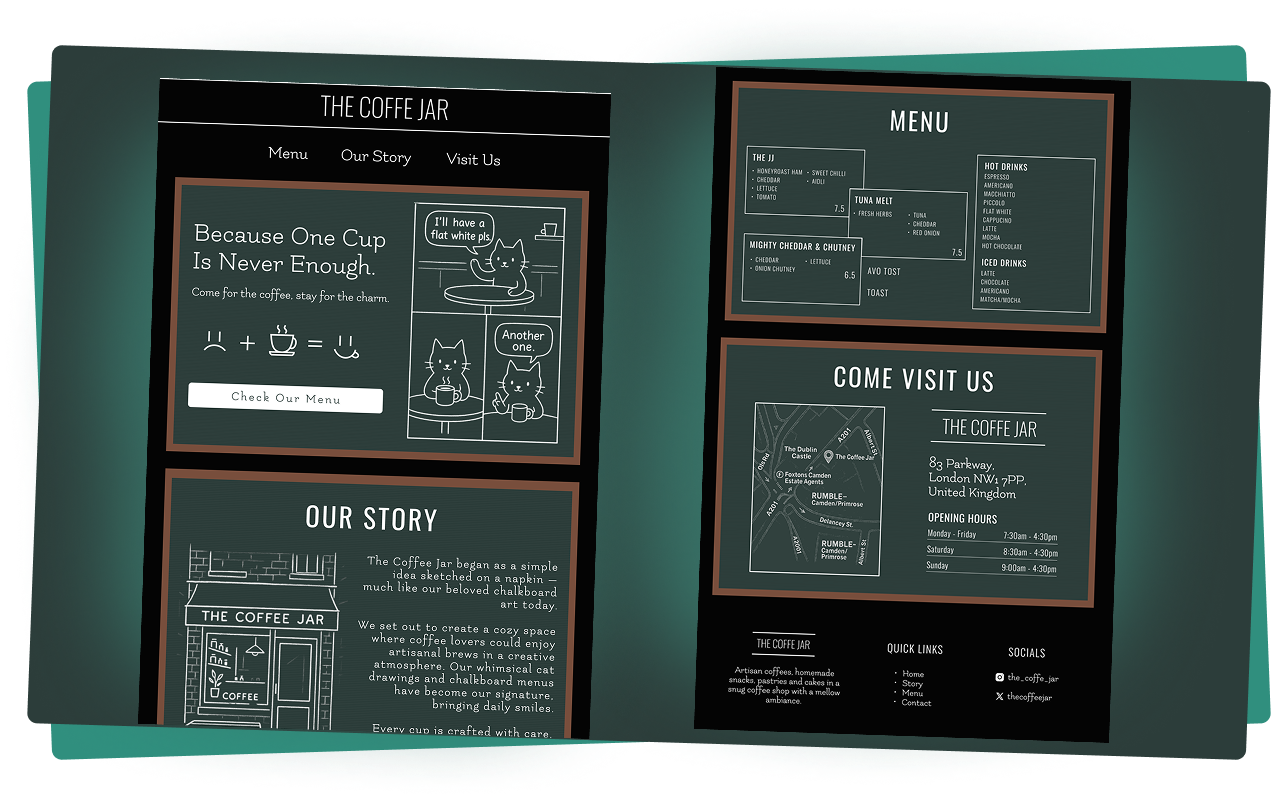 A personalized website design inspired by the hand-drawn blackboard art inside the Coffee Jar café. This concept blends local charm with modern design, capturing the shop's unique personality through custom visuals and an inviting user experience.